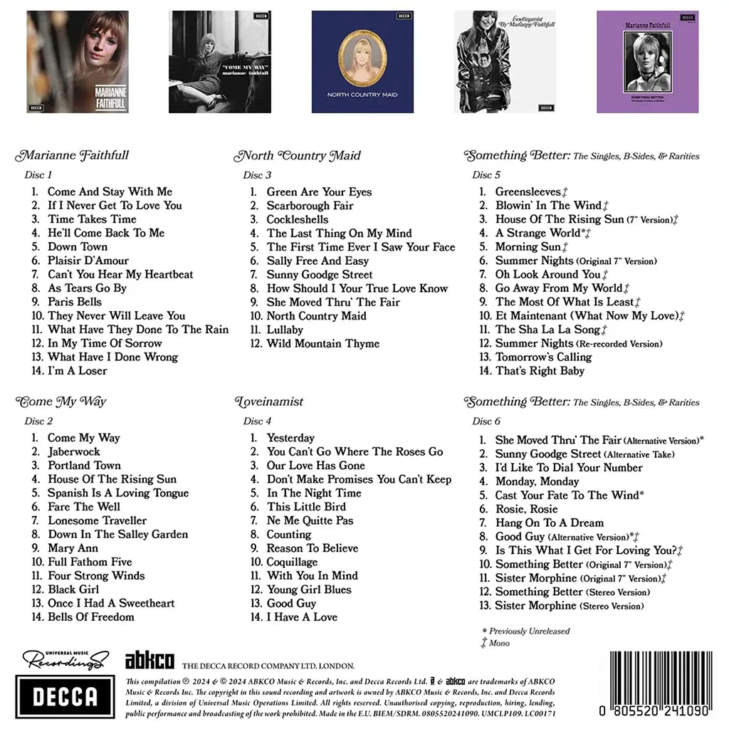 Cast Your Fate To The Wind: The Complete UK Decca Recordings is the first ever CD boxset of Marianne's Decca recordings - The set features all four original albums Marianne Faithfull, Come My Way, North Country Maid and Loveinamist reproduced on miniature facsimile LPs, as well as a further two discs of non-album singles B-sides and rarities. The set has been remastered from the original tapes by the Grammy nominated Andrew Batt who also wrote detailed sleevenotes which Marianne contributed to before her passing in January 2025. The liner notes are reproduced in a luxury 76 page book featuring many rare and unpublished photographs, and the boxset includes five art cards. Disc 1 features her first pop long player Marianne Faithfull. The album was produced by Mike Leander one of the key musical forces behind the British 60s pop scene, and features a mix of popular cover versions, folk revival standards, French pop and songs written specifically for Marianne including two of her biggest hits on both sides of the Atlantic; namely her Jagger / Richards penned debut single 'As Tears Go By', and 'Come And Stay With Me' by Jackie DeShannon. Released on the same day as her eponymous pop LP, Disc 2 features Come My Way, a folk album based around tracks from the American folk revival that Marianne had been performing in local folk clubs before she was signed. The album was produced and arranged by Jon Mark who is joined on acoustic guitar by Big Jim Sullivan, one of the most in-demand and versatile studio musicians of the 60s, alongside John Paul Jones (later of Led Zeppelin) on bass. On tracks like 'Mary Ann' and 'House Of The Rising Sun', the trio achieve a frequently perfect blend of the folk revival sound infused with some unexpected jazz flourishes. Disc 3 features Marianne's third Decca album North Country Maid. Where Marianne's first folk album had largely been compiled from music of the American folk revival, its follow up, released in April 1966 was built around songs from the British Isles. Rightly hailed as Marianne's finest LP of the 60s, North Country Maid conclusively established her as an artist with a unique stylistic approach, and many of its songs (such as 'Scarborough Fair') were not yet the established folk/pop standards they would soon become. Featuring emotive interpretations of songs by contemporary folk writers like Cyril Tawney's 'Sally Free And Easy', Bert Jansch's 'Green Are Your Eyes' and Ewan MacColl's 'The First Time Ever I Saw Your Face', the album also includes traditional material such as the title track and 'She Moved Thru' The Fair', which is one of the few songs Marianne performed throughout her life; it even appears on her final release, the 2025 E.P. Burning Moonlight. Disc 4 includes Marianne's fourth and final Decca album Loveinamist. The release was a hybrid comprised of earlier hit singles 'Yesterday' and 'This Little Bird' alongside tracks released on her US only album Faithfull Forever 7 months earlier, and new recordings in the folk-pop style that defined her signature sound. The album features a clutch of impressive interpretations from the songwriters that suited her best, including a string laden 'Counting' by Bob Lind, a stoic 'Reason To Believe' by Tim Hardin, gorgeous folk-pop ballad 'With You In Mind' by Jackie DeShannon, and the baroque psychedelia of Donovan's 'In The Night Time'. Discs 5 and 6 group together all Marianne's non-album singles, B-sides and rarities released in the UK alongside four previously unreleased recordings. These include 'A Strange World', the pop track earmarked by her discoverer Andrew Loog Oldham as the follow up to 'As Tears Go By' but abandoned in favour of Marianne's choice of Bob Dylan's 'Blowin' In The Wind' (also included), a haunting acapella version of 'She Moved Thru The Fair' from the North Country Maid sessions, an outtake from Loveinamist that gives this set its title, and an alternative version of Donovan's trippy 'Good Guy' also from Loveinamist. The compilation also includes a couple of Marianne's early compositions 'Oh Look Around You' and 'I'd Like To Dial Your Number' that appeared on the B-sides of her UK singles, alongside more well-known releases like her only UK EP Go Away From My World (featuring 'The Most Of What Is Least' written for her by Donovan), and a series of singles including 'Summer Nights' (included here in its original 7\" version as well as the more well-known recording that appeared on her greatest hits), 'Tomorrow's Calling' and her superlative cover of The Ronettes' 'Is This What I Get For Loving You?' The collection closes with Marianne's final Decca release 'Something Better' which signified the end of an era in more ways than one, even though it would be the self-penned lyrics to the B-side, 'Sister Morphine', that became a defining artistic statement, and one that eventually led Marianne to her next musical quantum leap.
