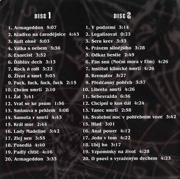 Kladivo na carodejnice: Nahráno 15. - 26. 3. 1993 ve Studiu C. Upozornení! Tento materiál je výberem z let 1986 - 1989 a je zarazen jako nulté LP! Armageddon: Nahráno 17. 2. - 4. 3. 1990 ve Studiu C Institut klinické smrti: Nahráno 16. - 31. 12. 1990 ve studiu C Chcípni o kus dál: Nahráno 23. 5. - 6. 6. 1992 ve studiu C Compilation consists of 4 different albums.
