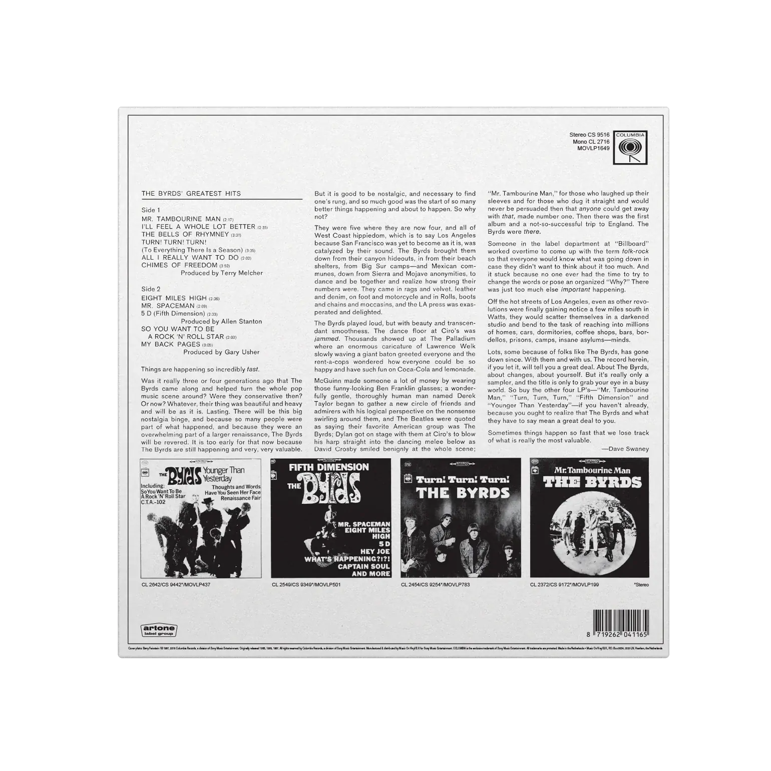 The Byrds' Greatest Hits is the first greatest hits album by American rock band The Byrds and was released in August 1967. It is the top-selling album in The Byrds' catalogue as it provides a summary of The Byrds' history during Gene Clark and David Crosby's tenure with the band and also functions as a survey of the group's hit singles from 1965 to 1967, a period when the band had its greatest amount of success on the singles chart. From classics such as “Mr. Tambourine Man”, “Turn! Turn! Turn! (To Everything There Is A Season)” and “Eight Miles High” these are chiming timeless songs that will fill your heart with warmth. The Byrds' Greatest Hits is part of the Groove Classics collection.