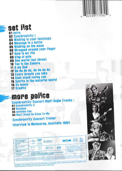 The Police Synchronicity Concert - the stunning live-in-concert extravaganza filmed during their Atlanta leg of their Synchronicity World Tour" in November 1983. Exclusive to this DVD are the four previously unseen multi angle tracks - Synchronicity II, Roxanne, Invisible Sun and Don't Stand So Close To Me. As an additional treat, the DVD also includes the original concert trailer and a rare interview with the band from their final concert on their "Synchronicity World Tour" (and their last ever Police concert) in Melbourne, Australia 1984. Twenty-two years later, this spectacular concert has never sounded better."