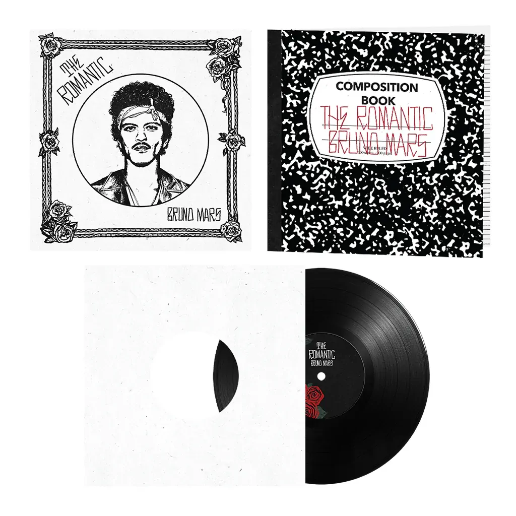 Standard Edition Black Vinyl. The Romantic is the fourth studio album by Bruno Mars. The 1 LP, single pocket jacket features a dress sleeve with an interior center die cut hole and includes an 8pg 12x12 lyric booklet. The Romantic, the new album from Bruno Mars. The fourth studio album from the global superstar and 16 time Grammy Award-winning artist marks Mars' first solo album release since 2017's 24k Magic and follows chart topping collaborations with Anderson .Paak as Silk Sonic, as well as smash hits with Lady Gaga and ROSÉ.